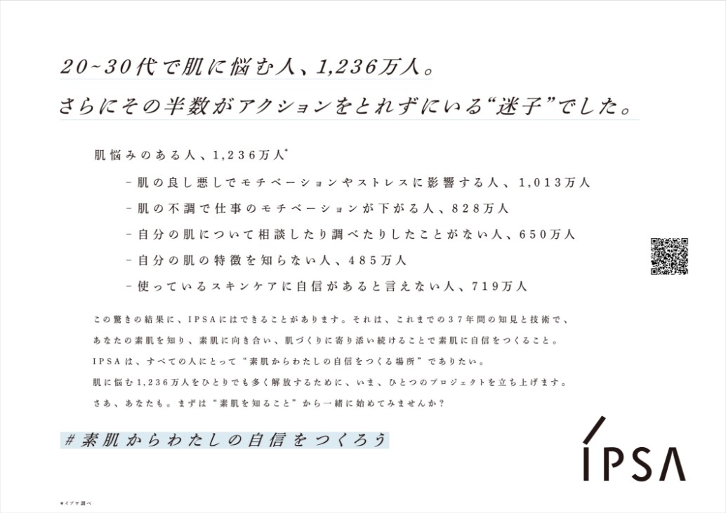化粧品ブランドIPSAが、 自主調査で20-30代で肌に悩む1236万人とその半数がアクションできていない肌迷子がいることが判明。素肌を37年間研究してきたIPSAが、肌悩みと肌迷子を解放するプロジェクト。プロジェクトを伝えるショートドラマは、5分半という長尺ならがも完全視聴30%もあり態度変容を創出した。